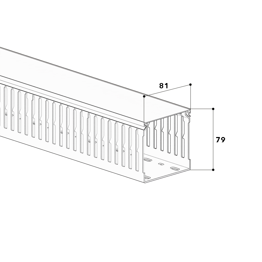 Slotted cable trunking made of PVC according to DIN EN 50085-2-3 for installation in switch cabinets, base with slotted side walls and with double-row base perforation according to DIN EN 50085-2-3, overlapping cover with a continuous labelling edge. The side bars can be broken out without tools, with the aid of notching pliers the side bars can be broken out down to the base. The wiring duct is VDE-tested and CSA-certified.
