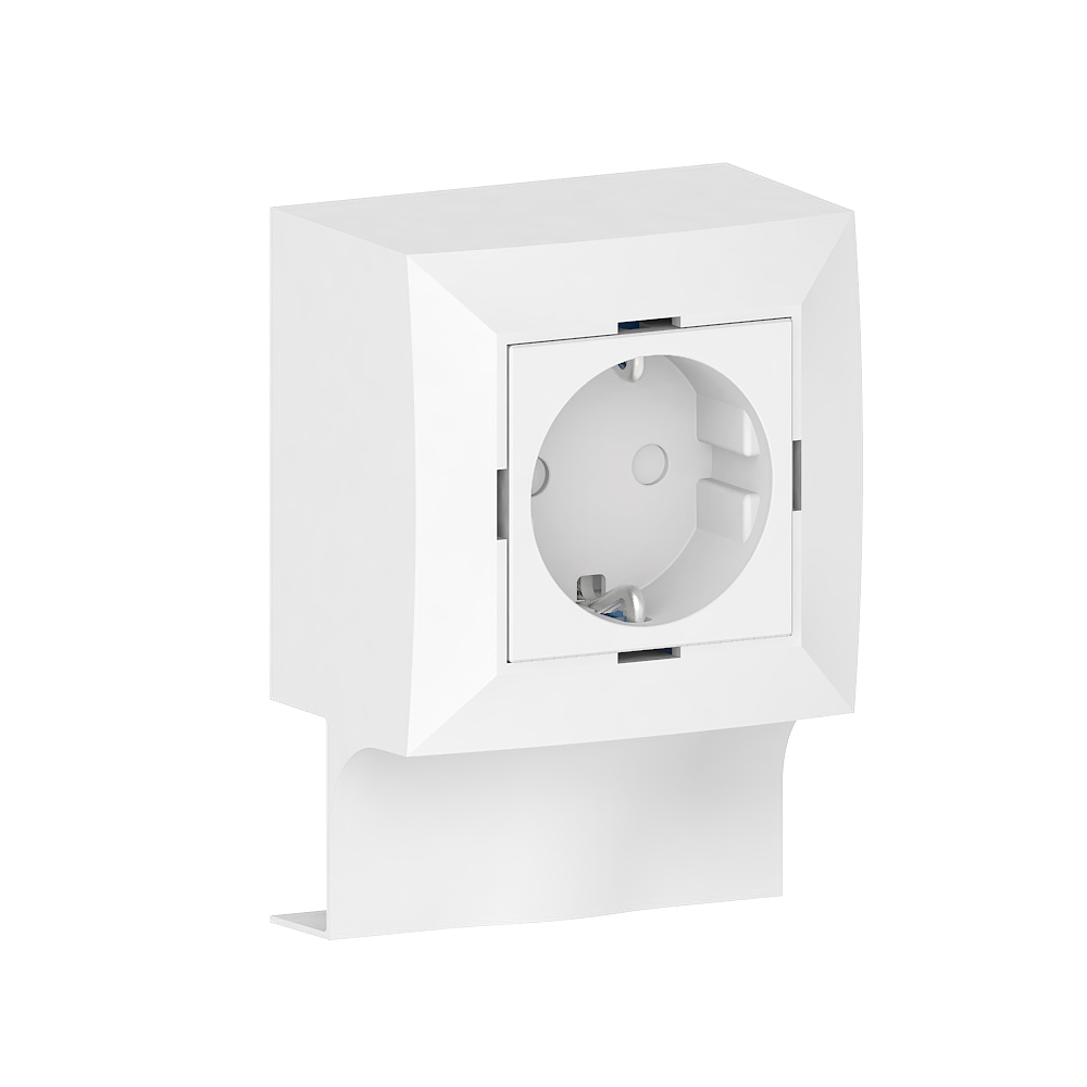 Surface-mounted box for freely positionable mounting on the installation trunking, with built-in socket, 0° straight, cable connection via plug-in terminals, 2-pole, 16 A/250 V~, with connection terminals to VDE 0620, suitable for 1 angled or flat plug, with increased contact protection to VDE 0620, with cover for the installation trunking.