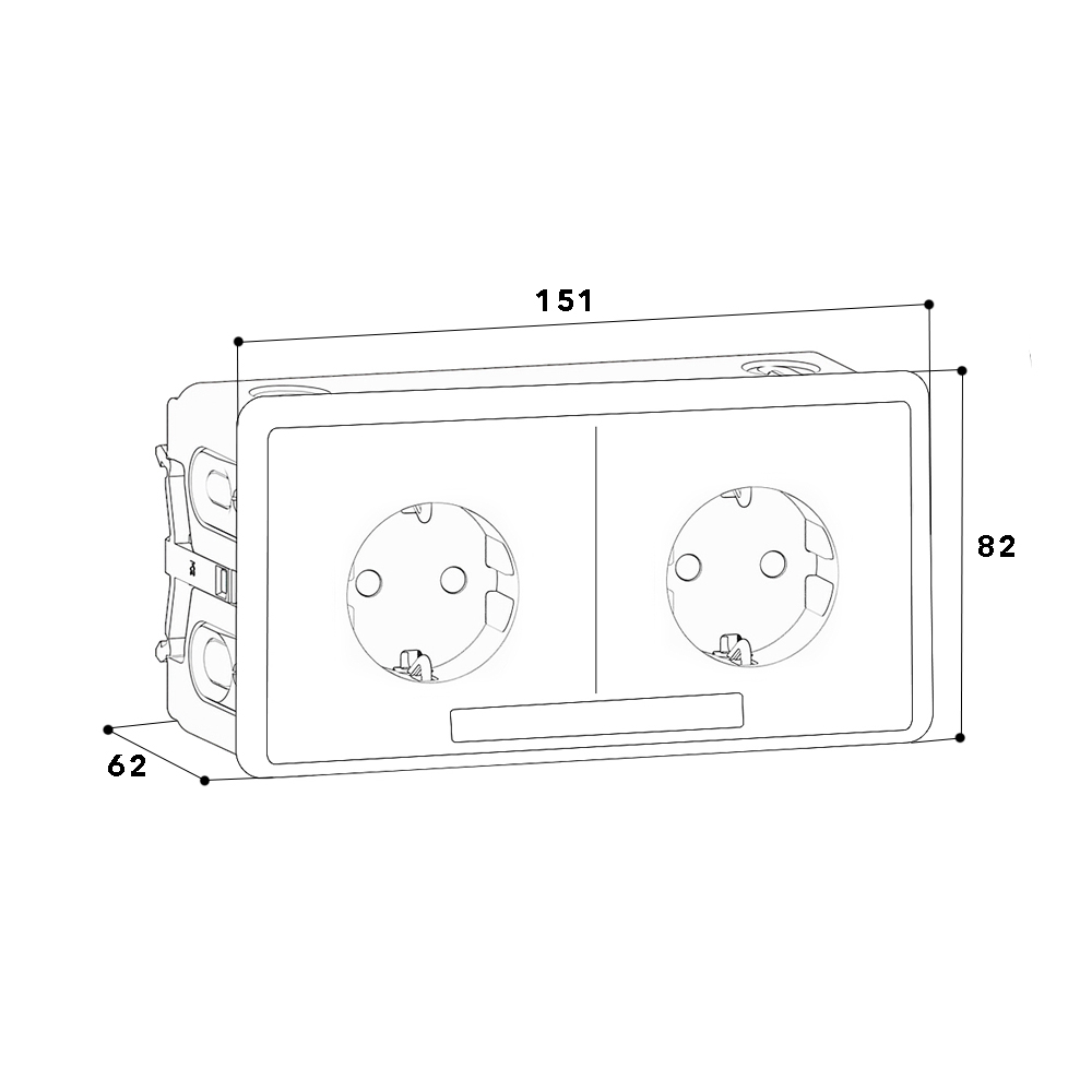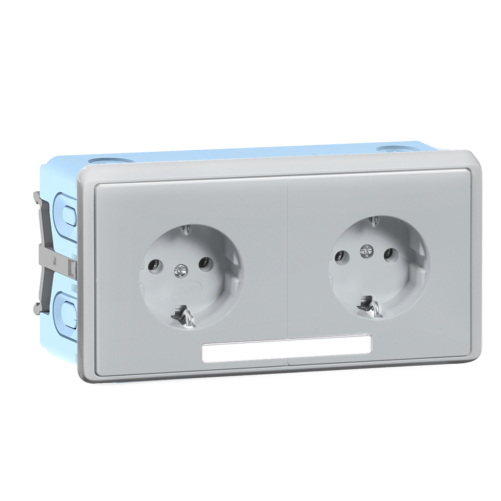 Double socket outlet including mounting box, cable connection via plug-in terminals, 2-pole, 16 A/250 V~, with connection terminals according to VDE 0620, suitable for 2 angle or surface plugs, with increased contact protection, with labelling field 7x64mm, for installation in trunking with a DIN rail and a height of 60 mm.