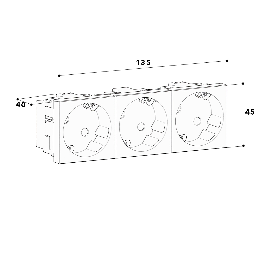 Triple socket outlet, 45° angled, cable connection via plug-in terminals, 2-pole, 16 A/250 V~, with connection terminals to VDE 0620, suitable for 3 angled or flat plugs, with increased protection against accidental contact to VDE 0620, for installation in wall trunking and service poles with 45 mm top section and all mounting frames/device carriers for accommodating compact M45 built-in devices, for vertical device installation.