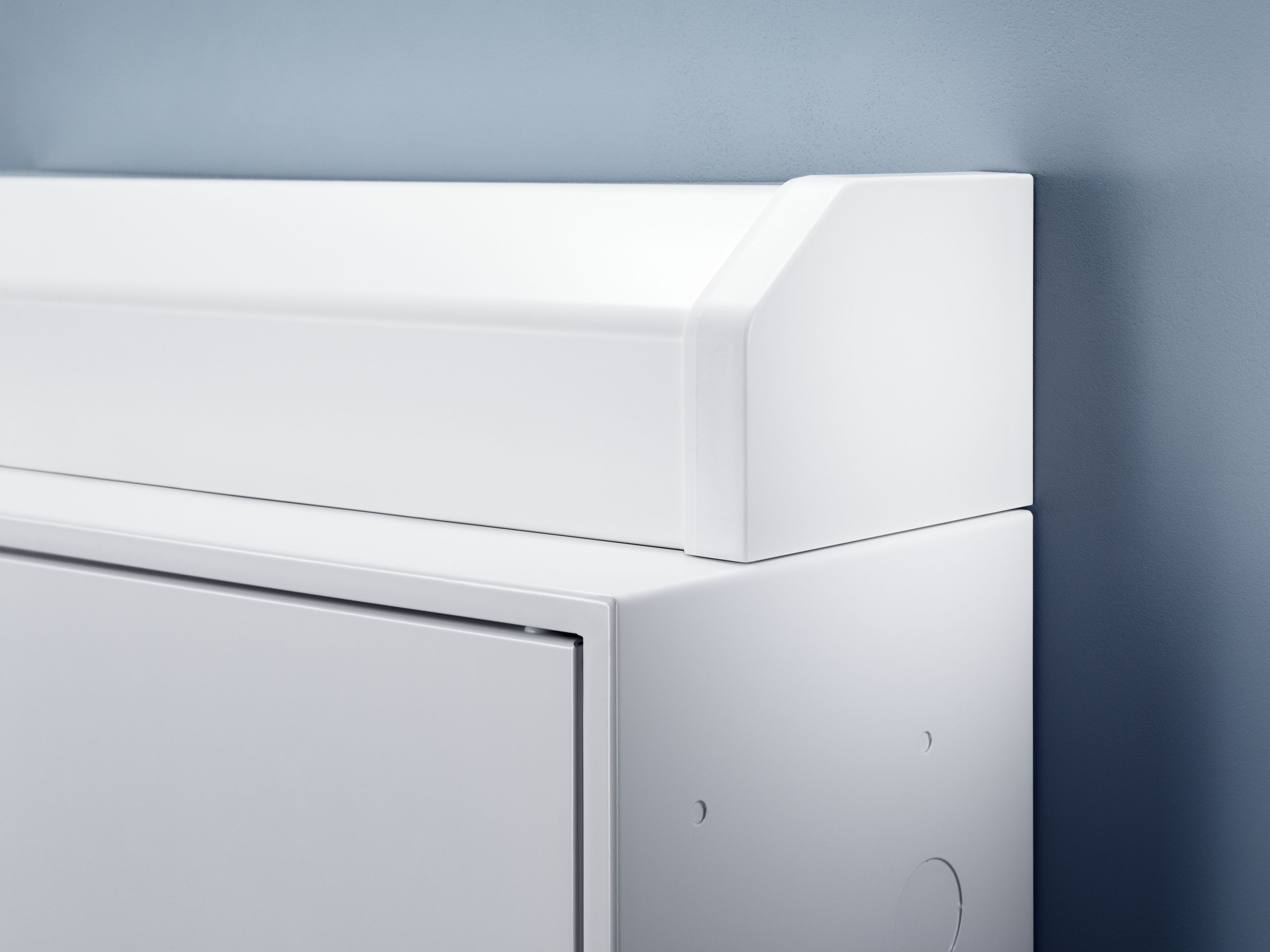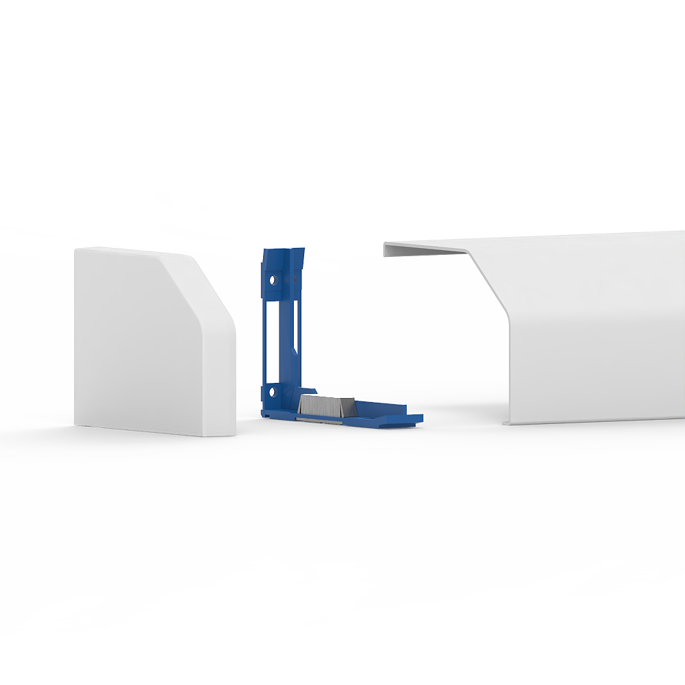 PVC transition cover section, for protection and as a transition from laid cables to distribution cabinets, set consisting of a cover profile, two profile holders with magnets for screwless mounting and an attachable pair of end pieces to cover the open sides on the left and right. Note: Due to the asymmetrical shape of the cover profile and the design of the profile holders, the same set can be mounted flexibly in height and width (H110 x W150 mm or H150 x B110 mm).