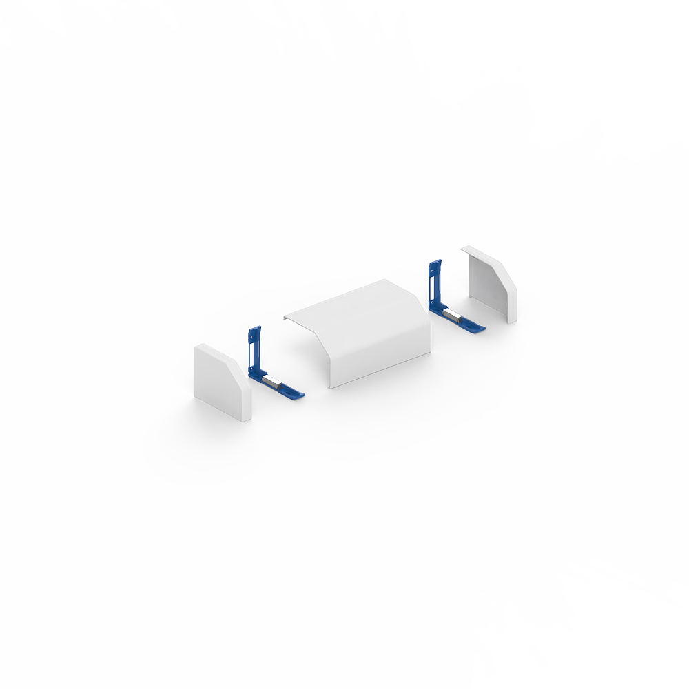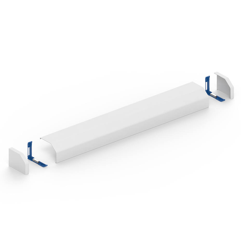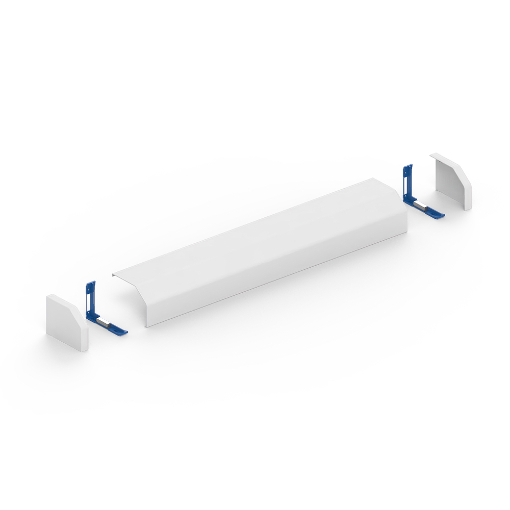 PVC transition cover section, for protection and as a transition from laid cables to distribution cabinets, set consisting of a cover profile, two profile holders with magnets for screwless mounting and an attachable pair of end pieces to cover the open sides on the left and right. Note: Due to the asymmetrical shape of the cover profile and the design of the profile holders, the same set can be mounted flexibly in height and width (H110 x W150 mm or H150 x B110 mm).