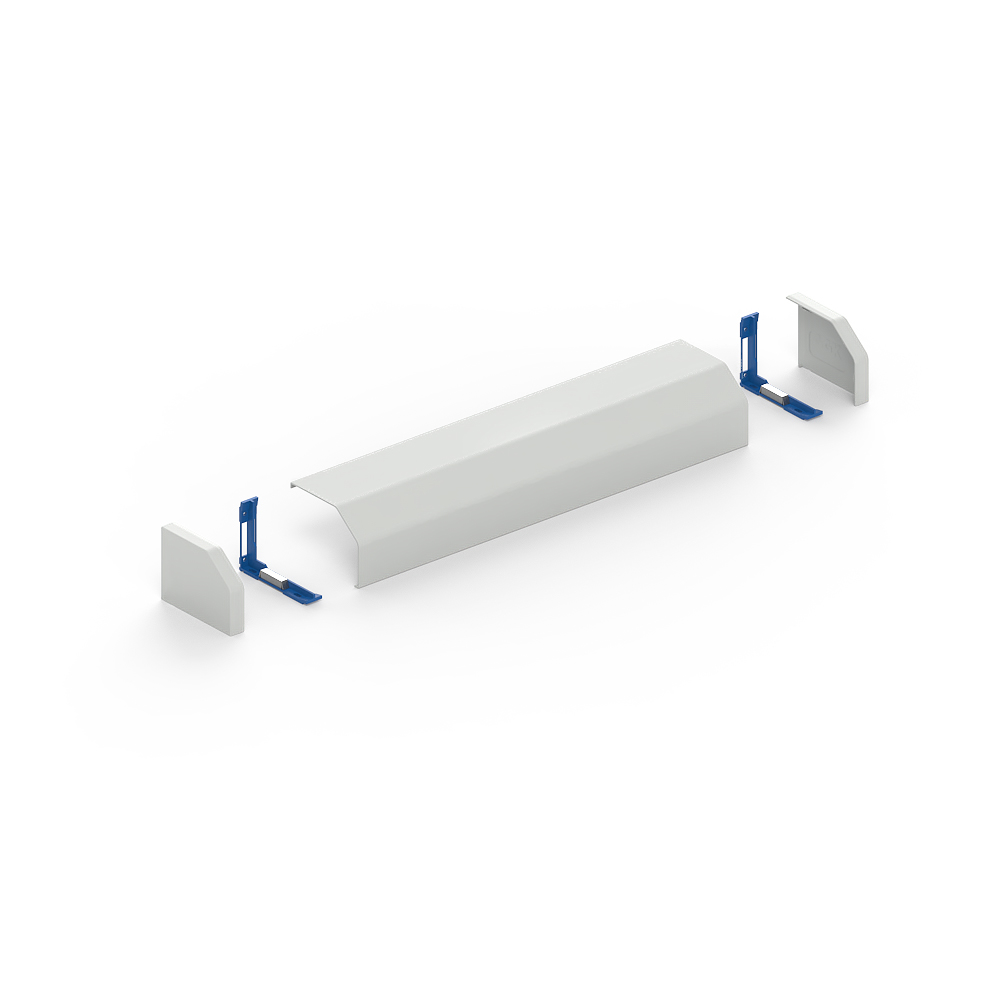 PVC transition cover section, for protection and as a transition from laid cables to distribution cabinets, set consisting of a cover profile, two profile holders with magnets for screwless mounting and an attachable pair of end pieces to cover the open sides on the left and right. Note: Due to the asymmetrical shape of the cover profile and the design of the profile holders, the same set can be mounted flexibly in height and width (H110 x W150 mm or H150 x B110 mm).