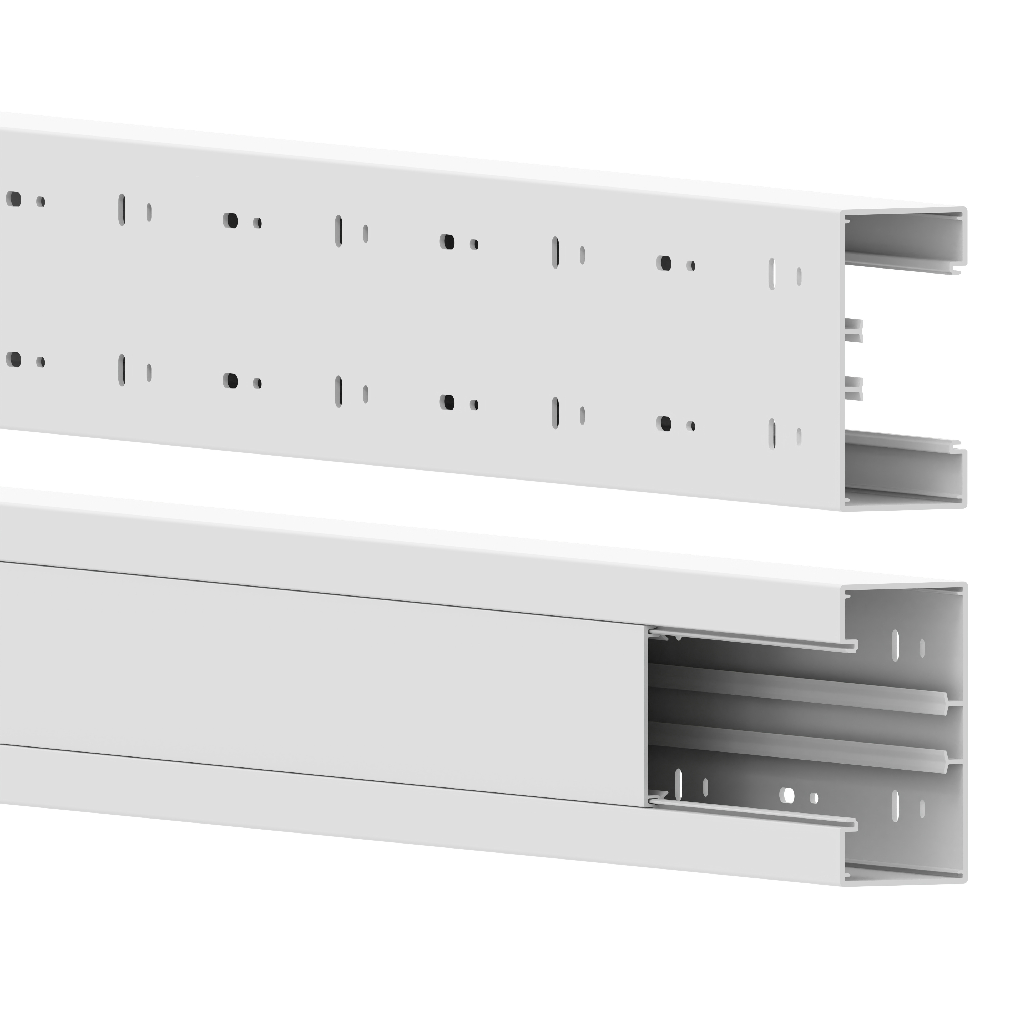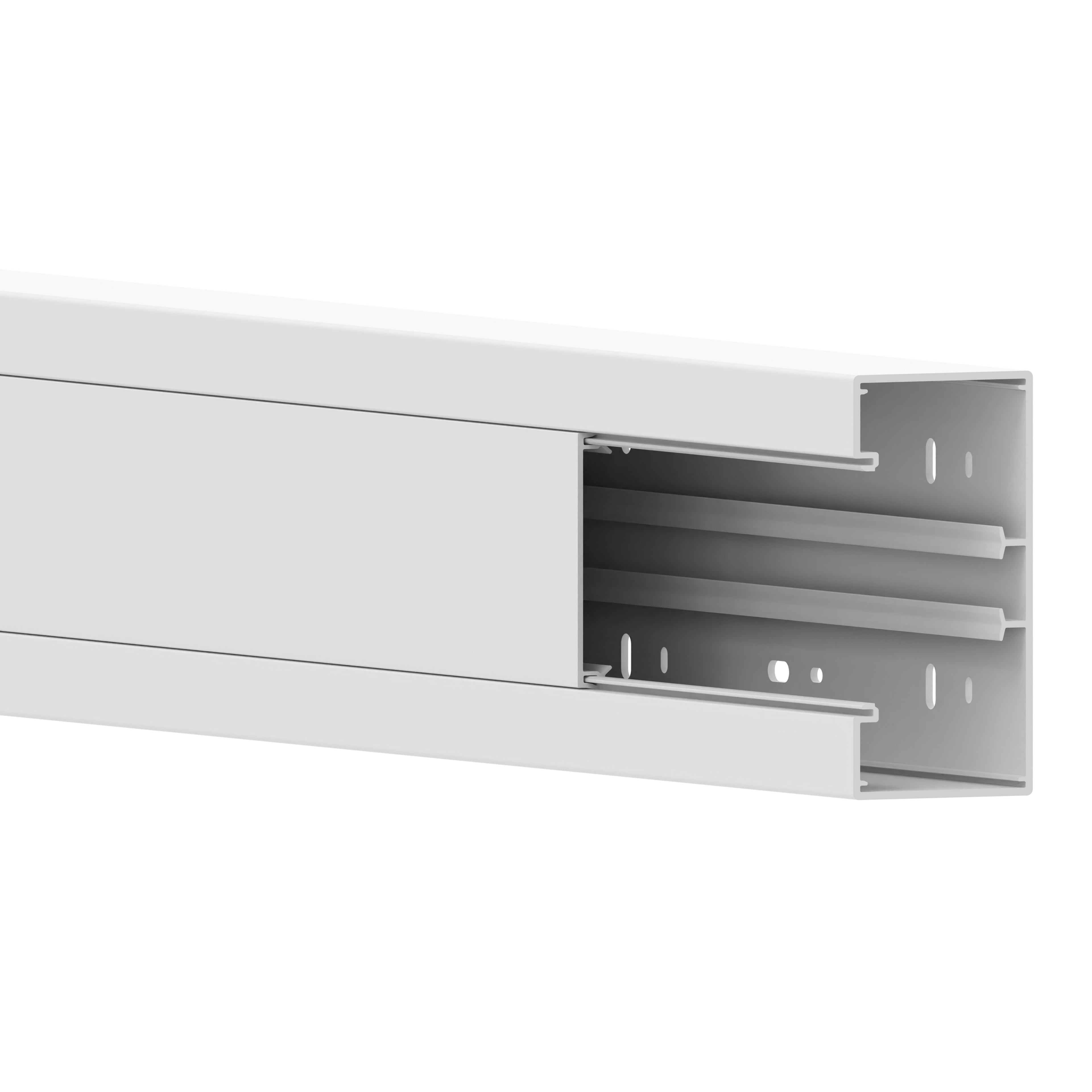 Wall duct made of PVC to DIN EN 50085-2-1 for cable laying directly on the wall or on wall brackets, 80 mm cover for device installation of commercially available switch ranges in combination with accessory mounting boxes or M45 built-in devices with the aid of front-locking adapter frames, base with four-row base perforation for fastening and a DIN rail for snap-in mounting of a plastic partition for separating cables. Couplings as mounting aids and for easy connection of two bases are additionally available as accessories. Note: Sound and fire protection measures must be carried out professionally.