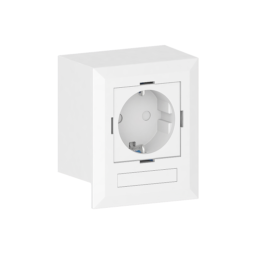 Support en saillie pour appareillages au format 45x45 mm positionnable sur le long de la goulotte à l'endroit souhaité et recouvrant la goulotte, avec prise encastrée, 0° droite, raccordement des câbles par bornes à fiches, 2 pà´les, 16 A/250 V~, avec bornes de connexion selon VDE 0620, approprié pour 1 fiche coudée ou fiche plate, avec protection accrue contre les contacts accidentels selon VDE 0620, avec couvercle recouvrant la goulotte .