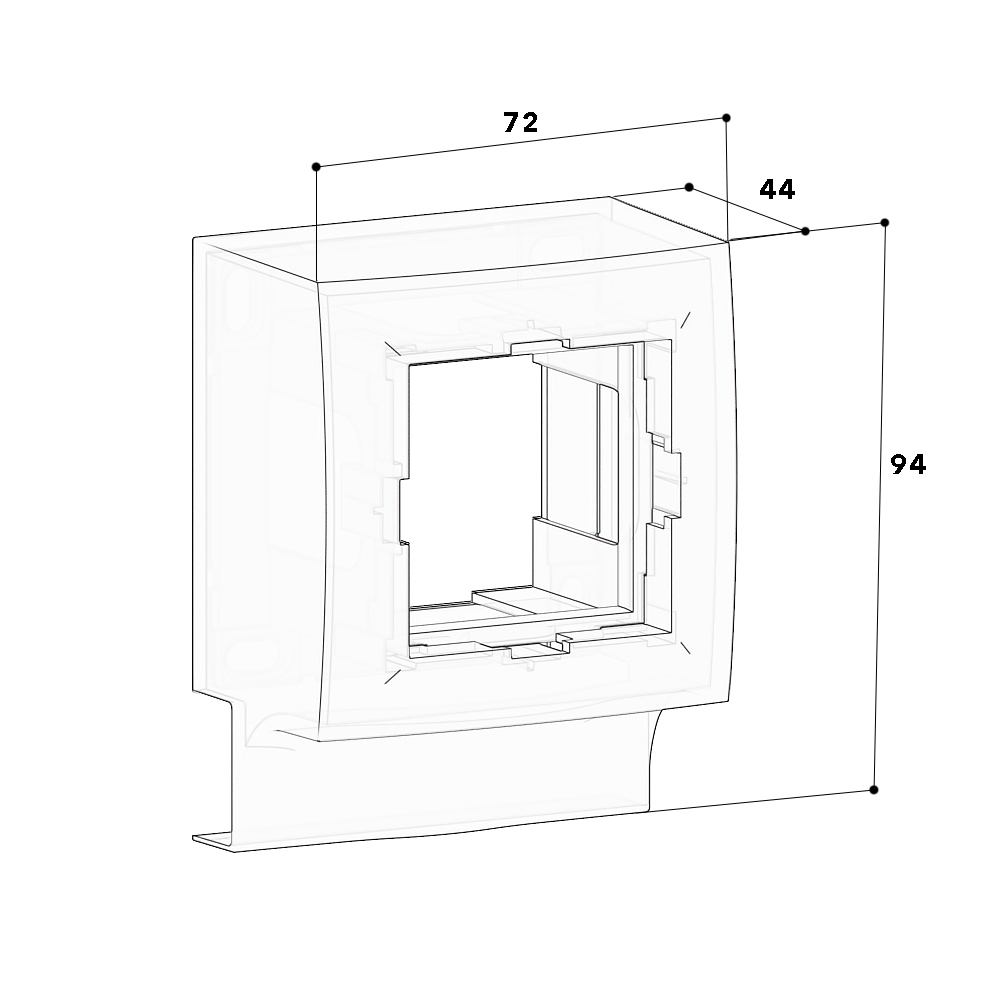 Boîtier support 45 mm montage en saillie pour goulotte de distribution, pouvant recevoir un appareillage au format 45x45 mm avec cache pour la jonction entre la goulotte et le support.