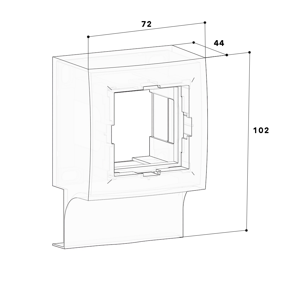 Boîtier support 45 mm montage en saillie pour goulotte de distribution, pouvant recevoir un appareillage au format 45x45 mm avec cache pour la jonction entre la goulotte et le support.