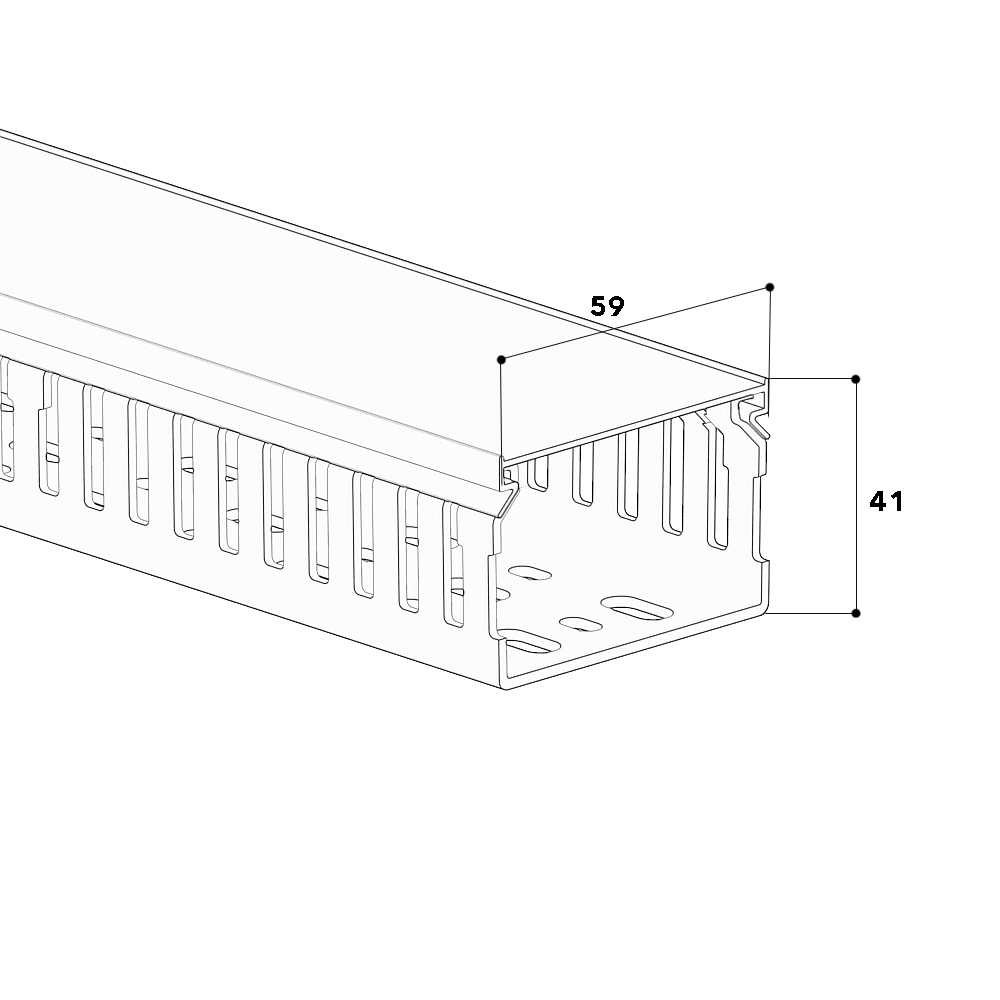 Goulotte de câblage en PVC selon DIN EN 50085-2-3 pour le montage dans des armoires électriques, embase avec parois latérales fendues et avec trois rangées de perforations sur le fond de l'embase selon DIN EN 50085-2-3, couvercle recouvrant avec une arête située tout le long pour un positionnement d'étiquette. Les lamelles latérales peuvent être découpées sans outil, elles peuvent être également découpées juqu'au fond à l'aide d'une pince . La goulotte de câblage est testée VDE et certifiée CSA.
