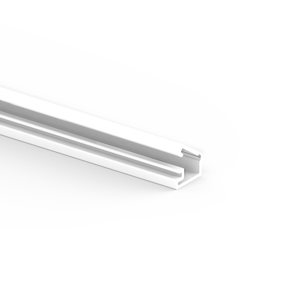 Goulotte en PVC pour la pose de câbles au mur et au plafond, composée d'une embase avec un film adhésif double face pour la fixation et d'un couvercle à charnière. Remarque : pour une utilisation à long terme, nous recommandons le clouage ou le vissage.