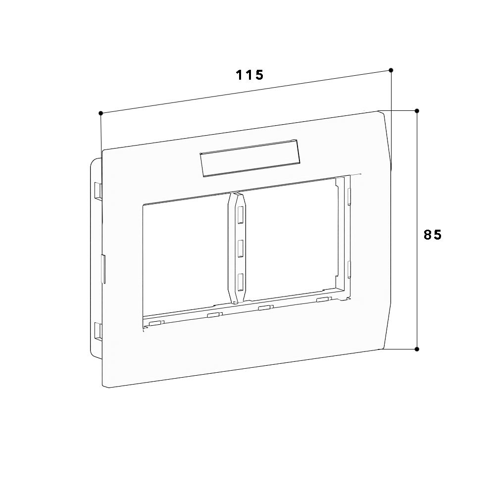 Prise double prémontée, composée d'un support de montage, d'un cadre de recouvrement avec emplacement pour étiquette de dimension 8x40 mm, d'une prise simple M45 0° droite, raccordement du câble par bornes à fiche, 2 pà´les, 16 A/250 V~, avec bornes de connexion selon VDE 0620, conçue pour 2 fiches coudées ou fiches plates, avec protection renforcée contre les contacts accidentels selon VDE 0620 pour l'installation dans des goulottes sous allège avec une ouverture couvercle de 76,5 mm de large pour une installation horizontale de l'appareillage. Remarque : la décharge de traction doit être commandée séparément.
